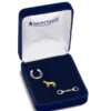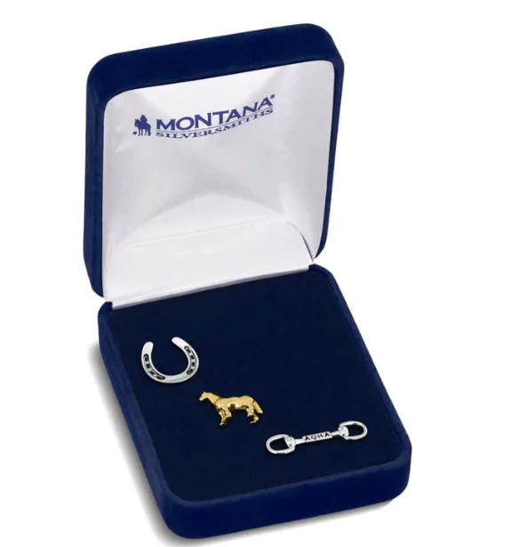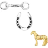 Wear your love for horses with the Enjoy the Ride Pins. Included in our AQHA collection, this design features three pins. The first is a silver tone snaffle bit pin featuring the letters AQHA through the center. A silver tone horseshoe pin is also included. Lastly a sculpted horse pin stands out in a beautiful gold tone. These pins are the perfect way to honor your love of horse riding during any occasion.
