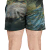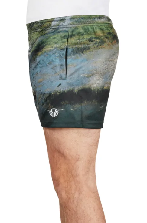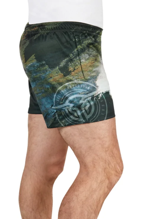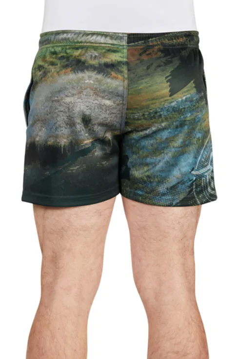 • Sports short with elasticated waist • Internal drawcord • Side welt pockets with concealed zip • Bullzye all over photographic print • Bullzye print on front hem