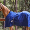 The Eureka Unlined Blue Canvas Rug is a waterproof ripstop of 16oz. 100% superior cotton canvas with ripstop polyester grids providing extra fabric strength. Waxed waterproofing treatment process, 3 way chest fitting allows versatile fitment, shoulder gussets, rope reinforced neck, single surcingle, rump darts, tail flap and matt black chest buckles, removable leg straps with nickel plated fittings.