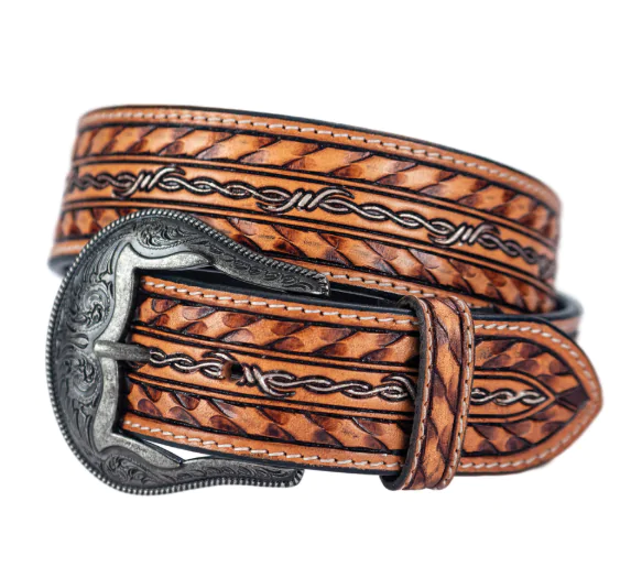 This beautifully crafted brown leather belt has a detailed silver barbed wire embossed design with threaded leather lace.