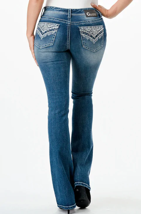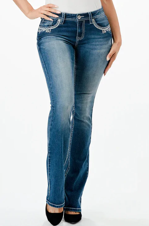 The Charme women’s bootcut jean in Easy Fit shows off your best shape by featuring a higher rise. The mid-rise creates a form-flattering fit for every curve. The jean is detailed with a western embroidery design, natural hand-sanding, and whiskering. The denim fabric has the perfect amount of stretch and great holding power.