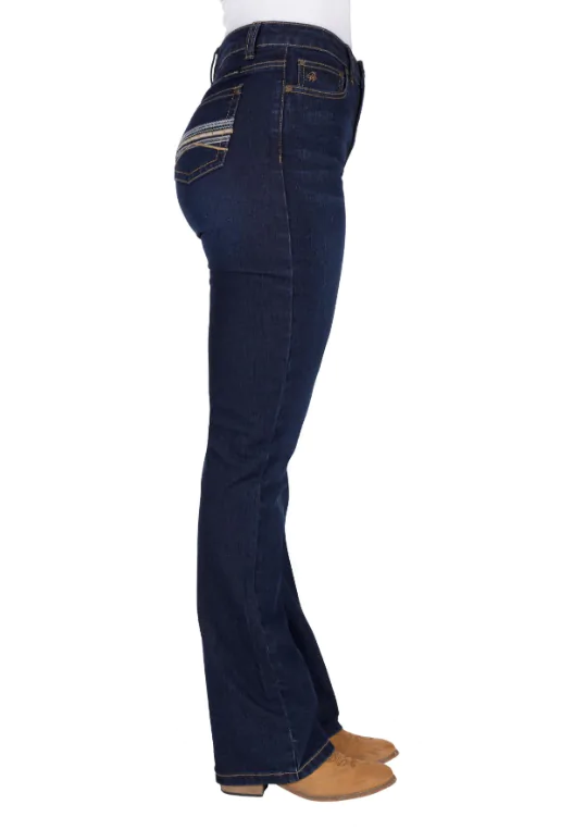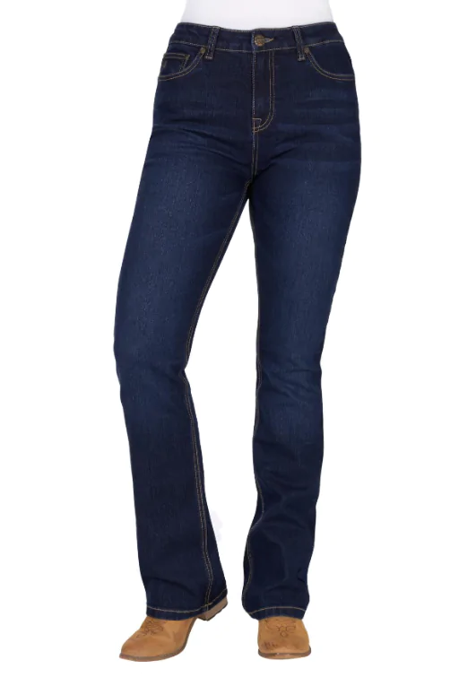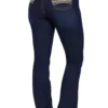 34” leg – Boot Cut, stretch for comfort and movement, highrise, logo shank button, metal rivets, woven logo label onback yoke, contrast all over topstitch