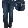 68% Cotton / 30% Polyester / 2% Elastane, Denim 11oz 34” leg – straight, stretch for comfort, mid rise, logo shank button, diamanté rivets, woven logo badge on back yoke, PW embroidery on coin pocket, feature embroidery on back pockets and front scoop pockets, small side split at hem, contrast all over topstitch