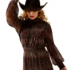 Fun, flirty, and here to party. With an eye-catching, is-that-leopard? print, this pleated dress will keep them guessing all night long. Gold metallic thread adds subtle shimmer, while the long sleeves and mock neckline elevate the entire look.
