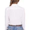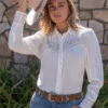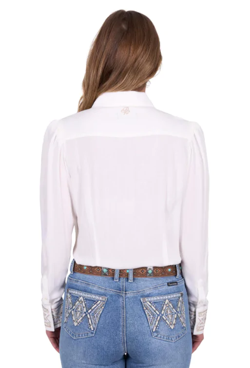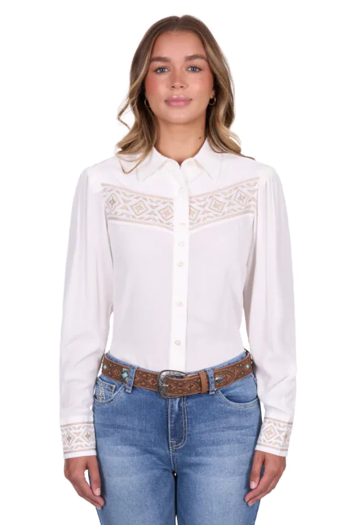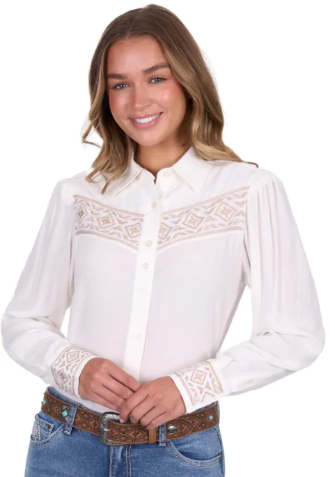 Classic button through long sleeve shirt,original hand drawn Aztec embroidery atfront yoke and sleeve cuffs, button closure,extra button at bust, gathering detail atsleeve head, Pure Western logo pip onside seam, soft hand feel and drape