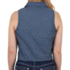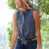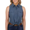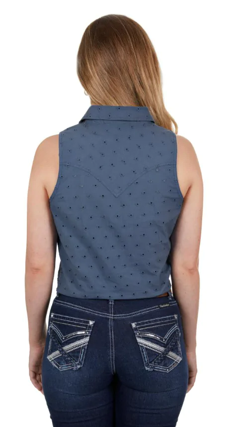 Classic western sleeveless shirt with tie knot detail at front hem, Diamond design broderie fabric, Button closure, Extra button at bust, Western chest pockets, Western front and back yokes, Pure Western logo embroidery on front hem, Pure Western logo pip on side seam, Soft hand feel